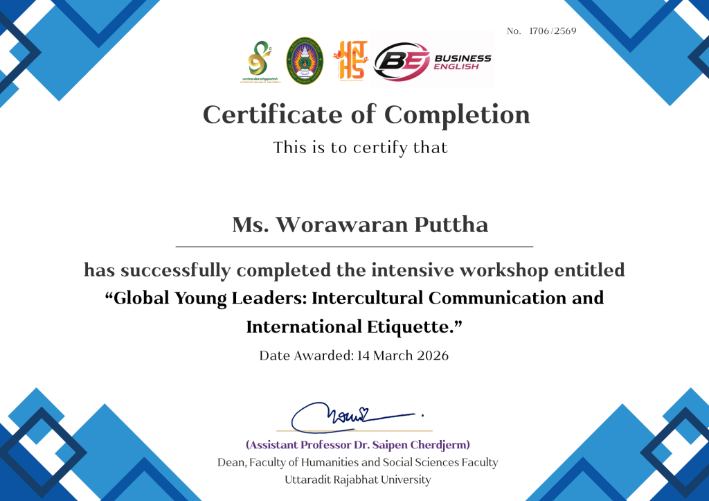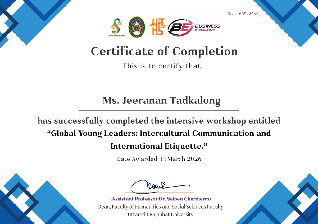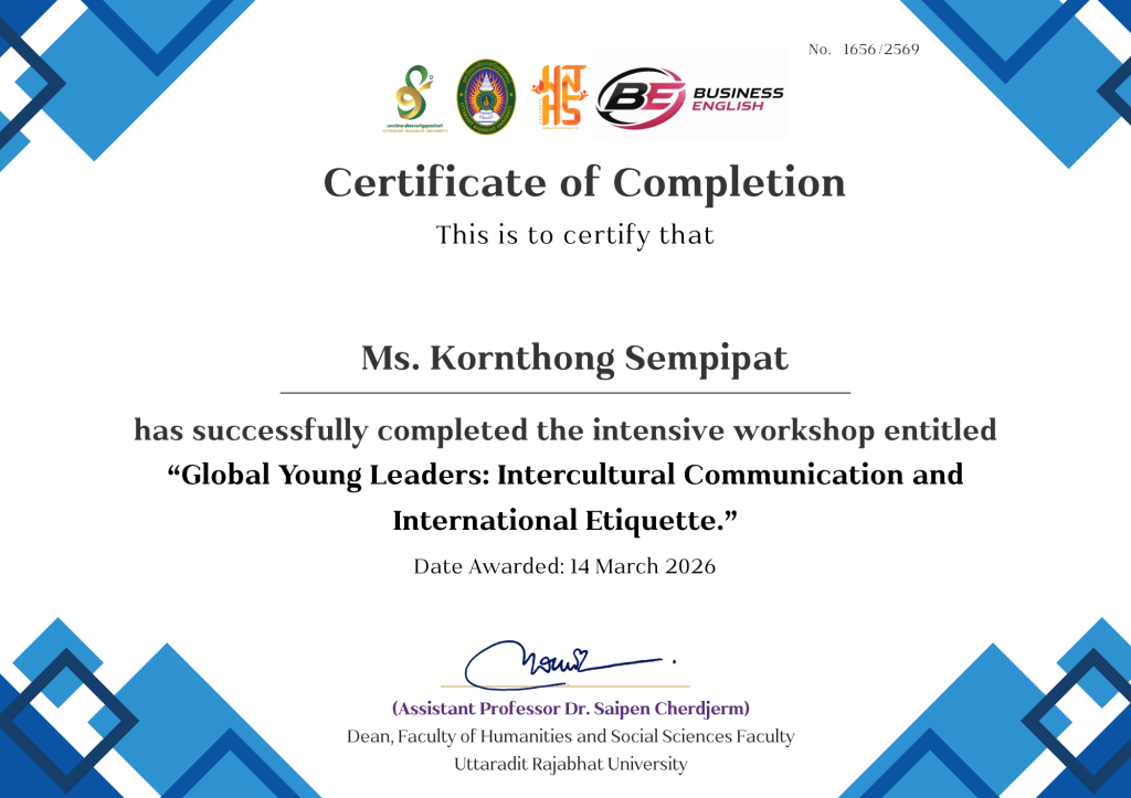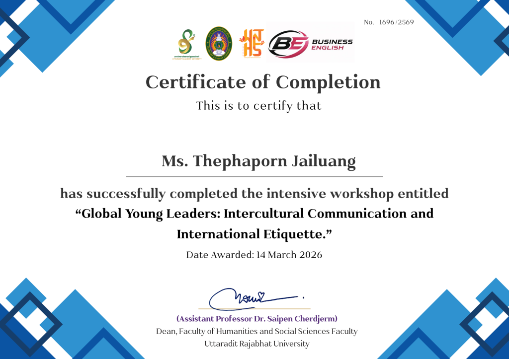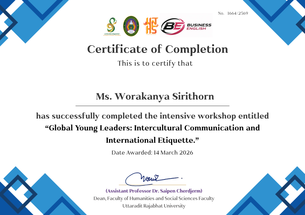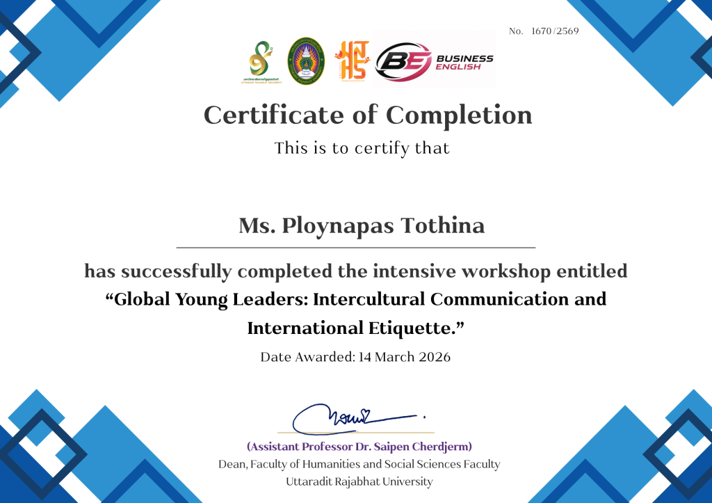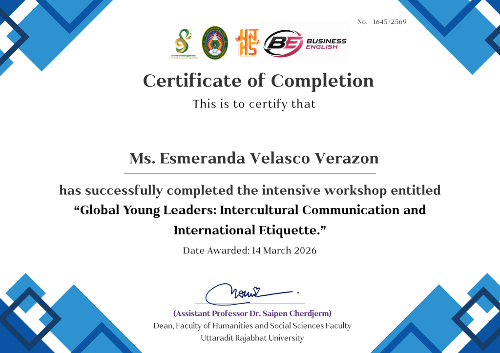 Certificate of Completion “Global Young Leaders: Intercultural Communication and International Etiquette.” Date Awarded: 14 March 2026