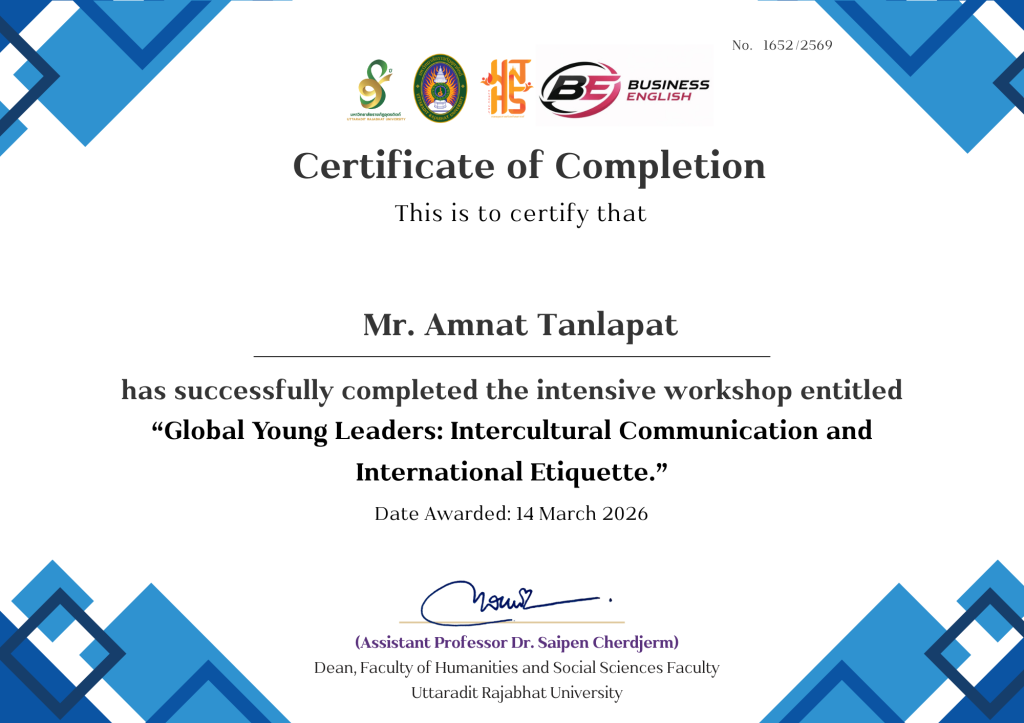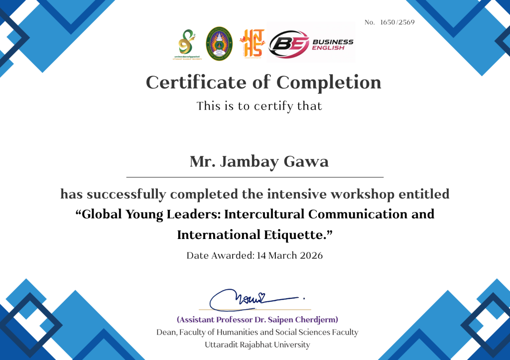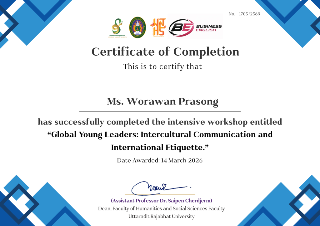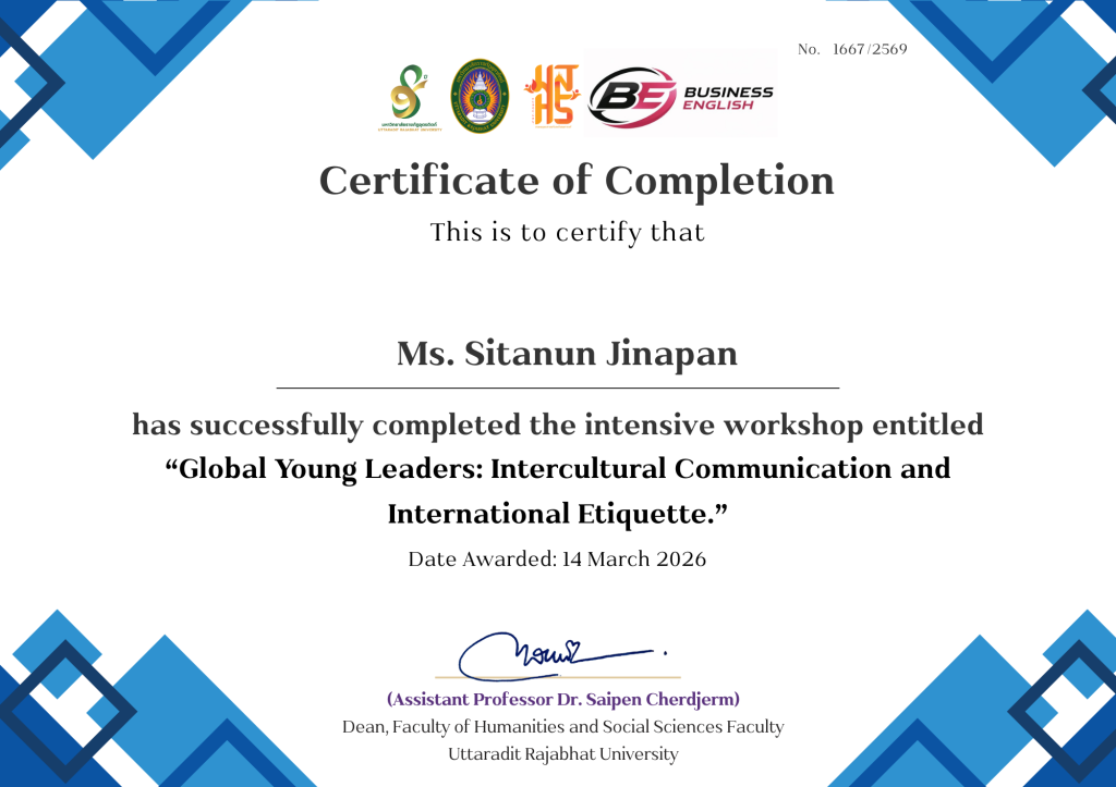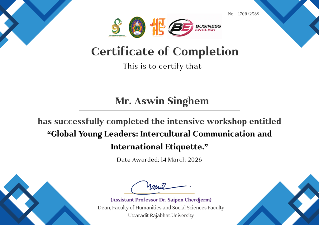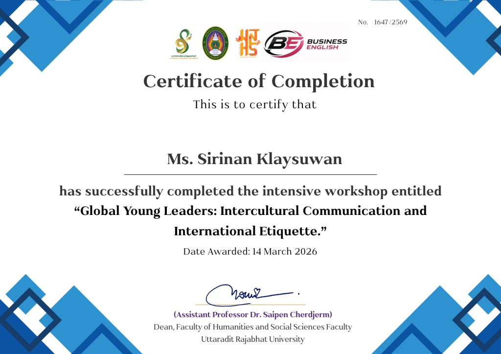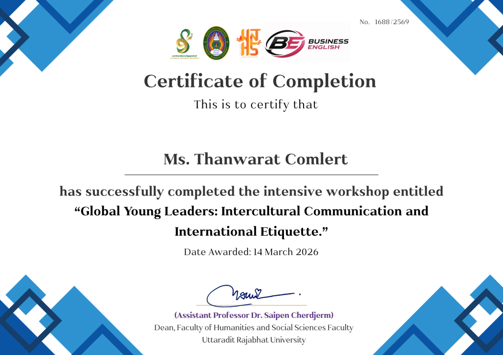 Certificate of Completion “Global Young Leaders: Intercultural Communication and International Etiquette.” Date Awarded: 14 March 2026