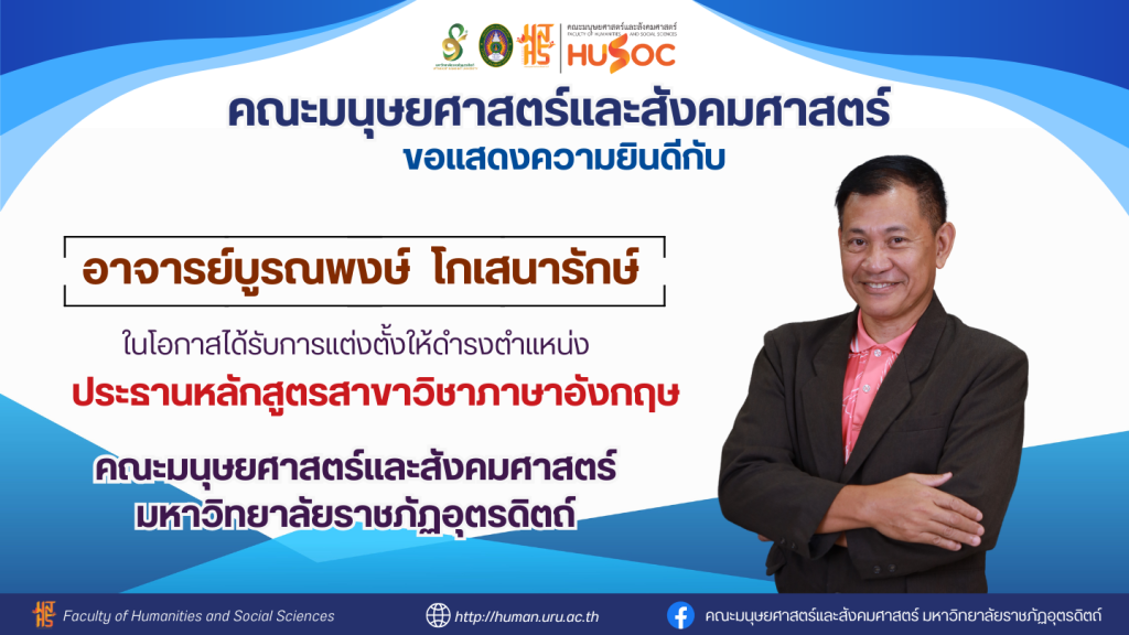 คณะมนุษยศาสตร์และสังคมศาสตร์ มหาวิทยาลัยราชภัฏอุตรดิตถ์ ขอแสดงความยินดีกับ อาจารย์บูรณพงษ์ โกเสนารักษ์ ในโอกาสได้รับการแต่งตั้งให้ดำรงตำแหน่ง ประธานหลักสูตรสาขาวิชาภาษาอังกฤษ