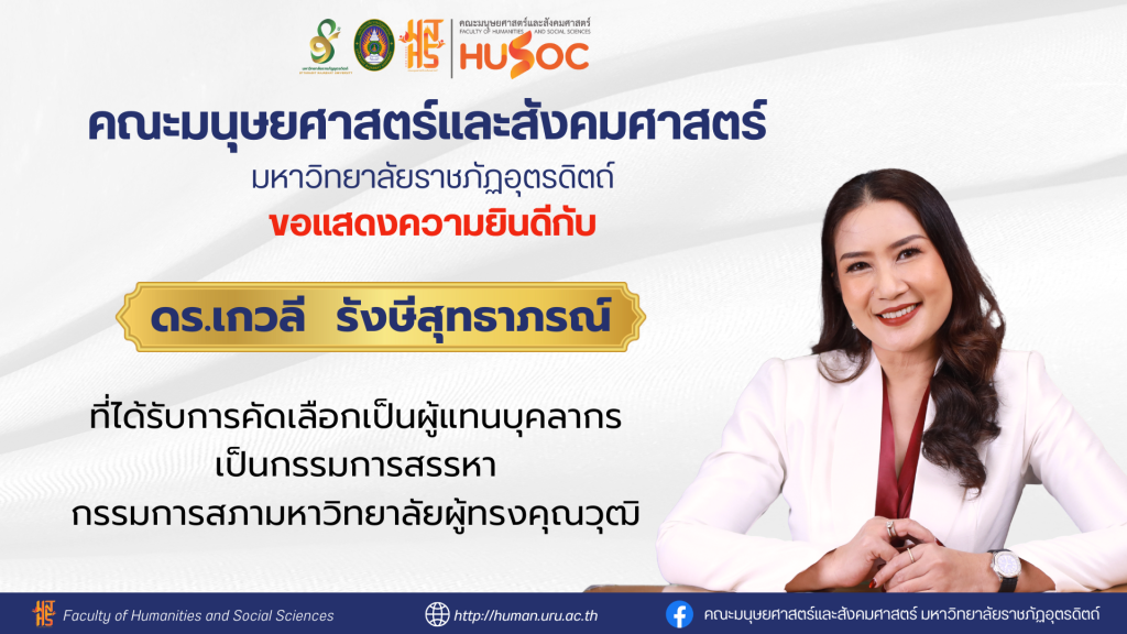 คณะมนุษยศาสตร์และสังคมศาสตร์ ได้แสดงความยินดีกับ ดร.เกวลี รังษีสุทธาภรณ์ ซึ่งได้รับเลือกให้เป็นผู้แทนบุคลากร เพื่อทำหน้าที่เป็น กรรมการสรรหา กรรมการสภามหาวิทยาลัยผู้ทรงคุณวุฒิ